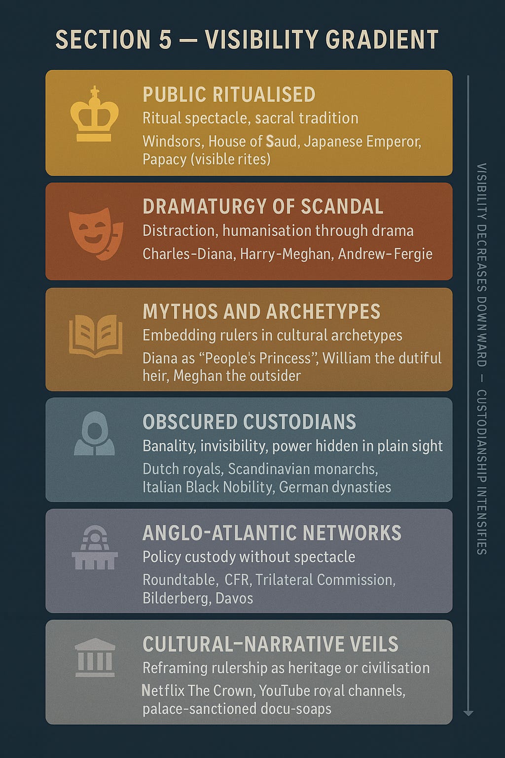Today this stratum endures through a calibrated visibility gradient: spectacle in coronations and conclaves, obscurity in submerged dynasties, quiet convenings in Round Table and Davos circuits, cultural veils in universities and museums. Looking forward, it projects permanence through ecological kingship, sovereign wealth custodianship, and techno-utopian megaprojects.